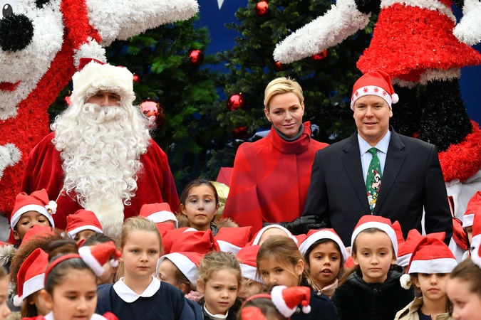 Ksiaze Albert w czapce Mikolaja i ksiezna Charlene w czerwonym plaszczyku