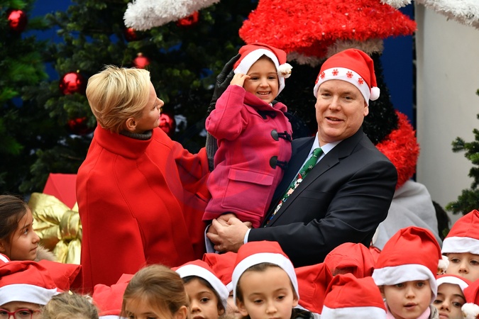 Ksiaze Albert w czapce Mikolaja i ksiezna Charlene w czerwonym plaszczyku