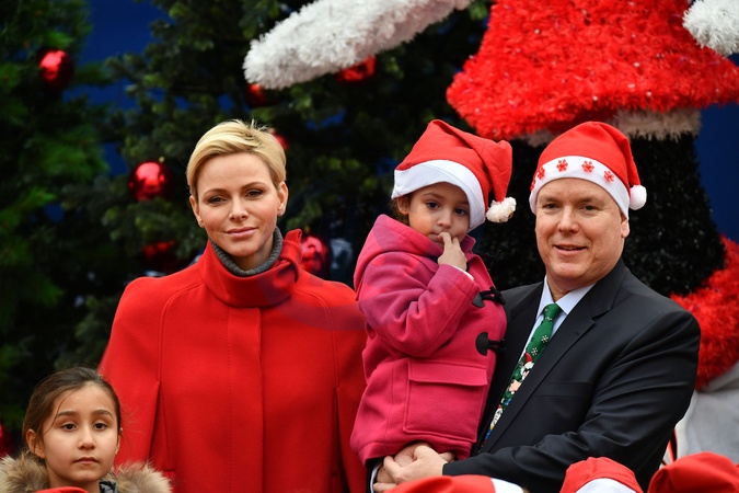 Ksiaze Albert w czapce Mikolaja i ksiezna Charlene w czerwonym plaszczyku