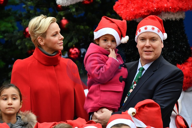 Ksiaze Albert w czapce Mikolaja i ksiezna Charlene w czerwonym plaszczyku