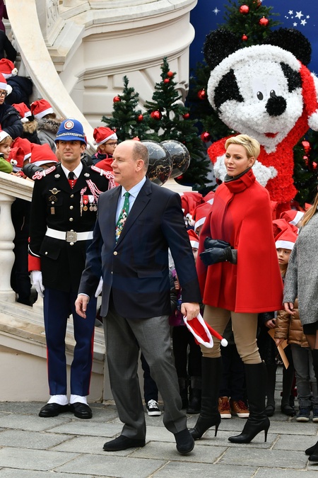 Ksiaze Albert w czapce Mikolaja i ksiezna Charlene w czerwonym plaszczyku