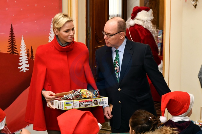 Ksiaze Albert w czapce Mikolaja i ksiezna Charlene w czerwonym plaszczyku