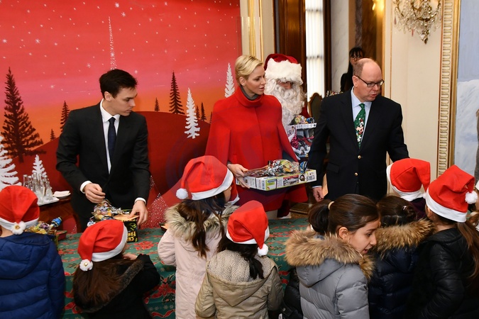 Ksiaze Albert w czapce Mikolaja i ksiezna Charlene w czerwonym plaszczyku
