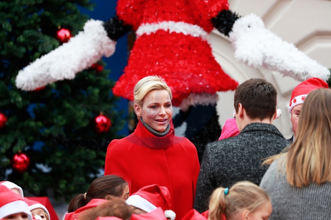 Ksiaze Albert w czapce Mikolaja i ksiezna Charlene w czerwonym plaszczyku