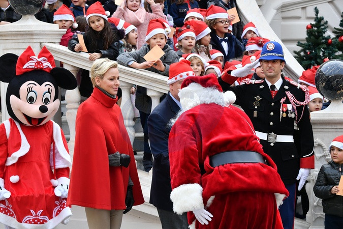 Ksiaze Albert w czapce Mikolaja i ksiezna Charlene w czerwonym plaszczyku