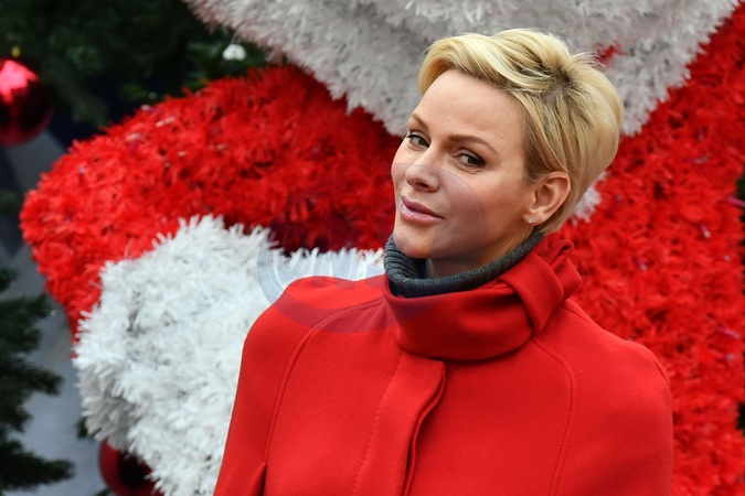 Ksiaze Albert w czapce Mikolaja i ksiezna Charlene w czerwonym plaszczyku