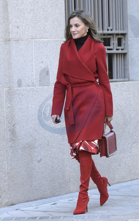 Elegancka krolowa Letizia w bordowym plaszczyku i bordowych kozaczkach