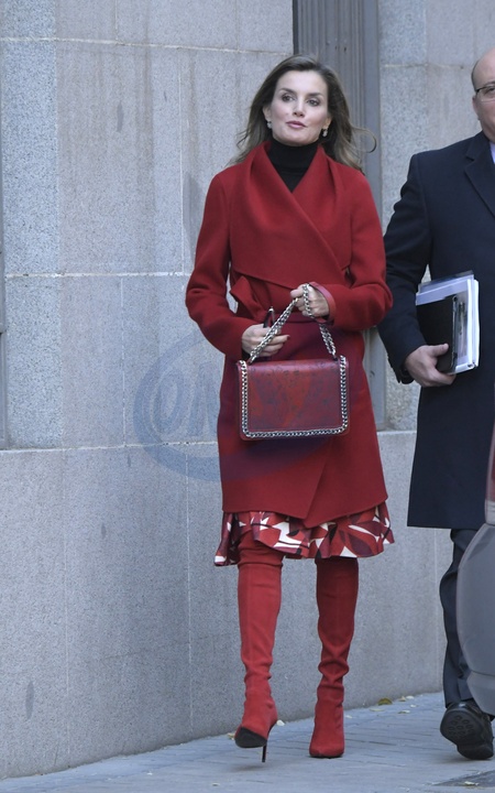 Elegancka krolowa Letizia w bordowym plaszczyku i bordowych kozaczkach