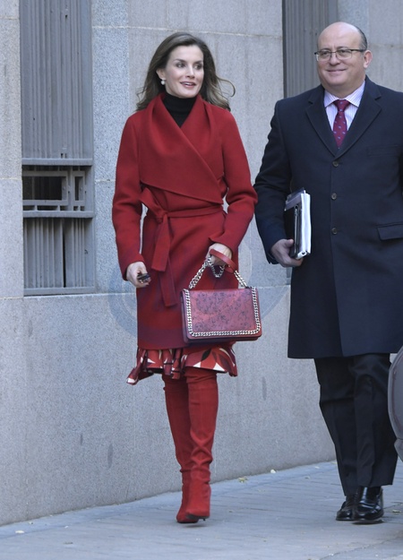 Elegancka krolowa Letizia w bordowym plaszczyku i bordowych kozaczkach