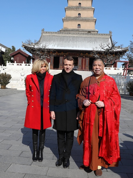 Brigitte Macron w czerwonym plaszczyku i Emmanuel Macron podczas wizyty w Chinach