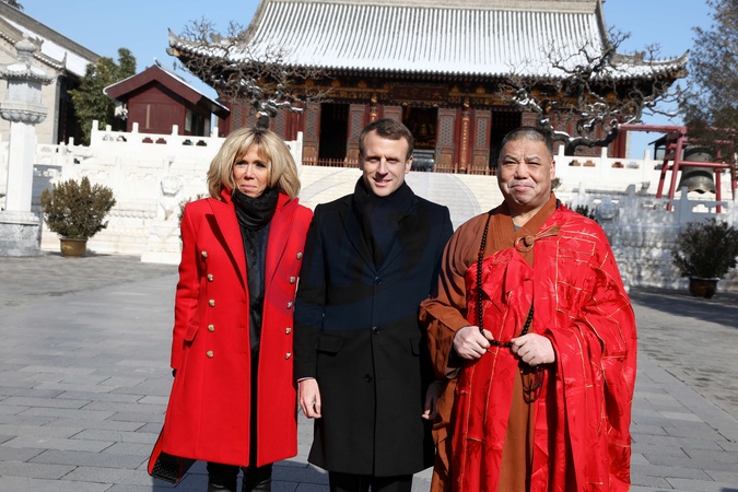 Brigitte Macron w czerwonym plaszczyku i Emmanuel Macron podczas wizyty w Chinach