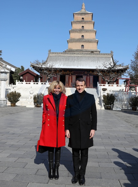 Brigitte Macron w czerwonym plaszczyku i Emmanuel Macron podczas wizyty w Chinach