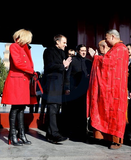 Brigitte Macron w czerwonym plaszczyku i Emmanuel Macron podczas wizyty w Chinach