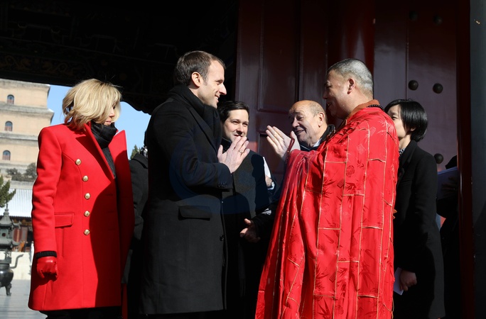 Brigitte Macron w czerwonym plaszczyku i Emmanuel Macron podczas wizyty w Chinach