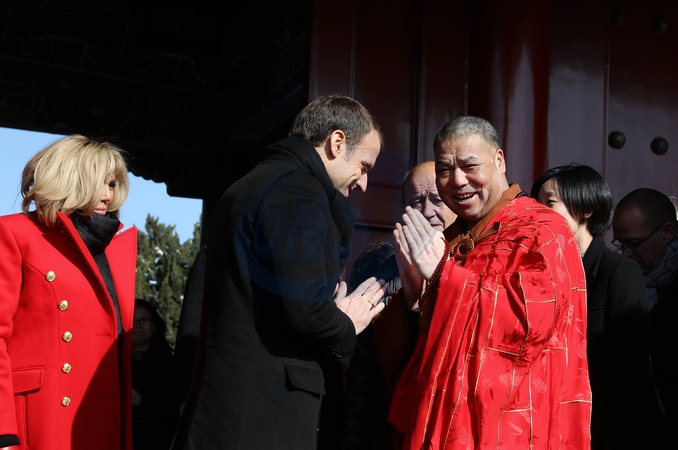 Brigitte Macron w czerwonym plaszczyku i Emmanuel Macron podczas wizyty w Chinach