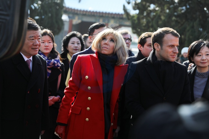 Brigitte Macron w czerwonym plaszczyku i Emmanuel Macron podczas wizyty w Chinach