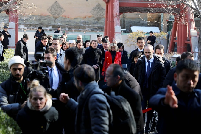Brigitte Macron w czerwonym plaszczyku i Emmanuel Macron podczas wizyty w Chinach
