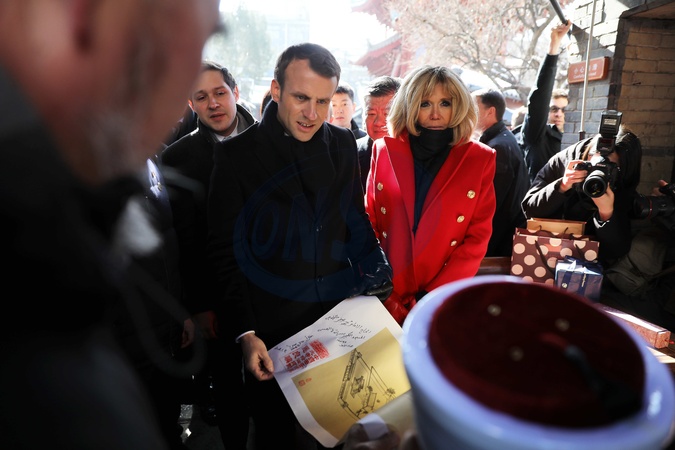 Brigitte Macron w czerwonym plaszczyku i Emmanuel Macron podczas wizyty w Chinach