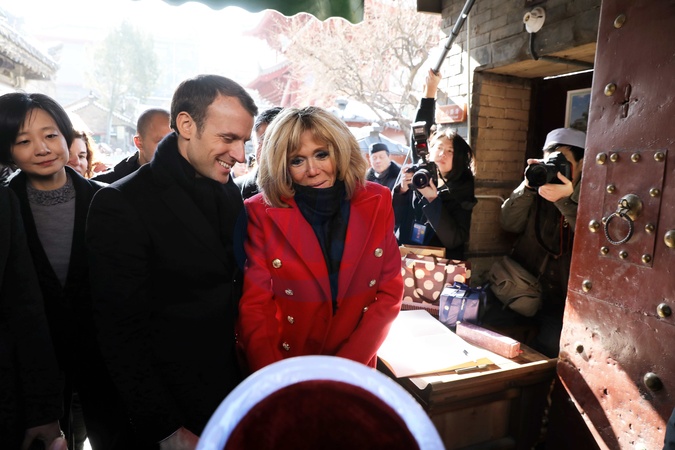 Brigitte Macron w czerwonym plaszczyku i Emmanuel Macron podczas wizyty w Chinach