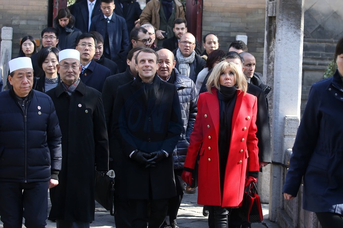 Brigitte Macron w czerwonym plaszczyku i Emmanuel Macron podczas wizyty w Chinach