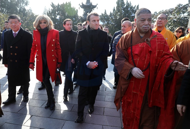 Brigitte Macron w czerwonym plaszczyku i Emmanuel Macron podczas wizyty w Chinach