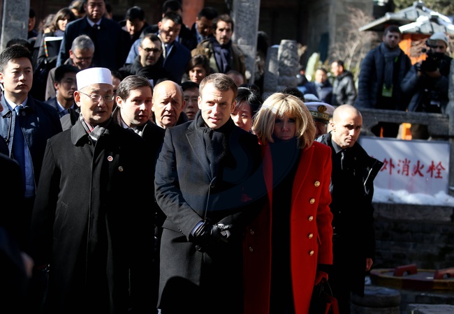 Brigitte Macron w czerwonym plaszczyku i Emmanuel Macron podczas wizyty w Chinach