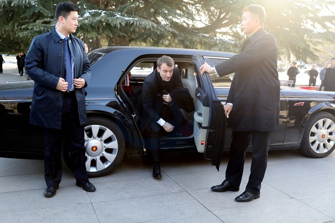 Brigitte Macron w czerwonym plaszczyku i Emmanuel Macron podczas wizyty w Chinach
