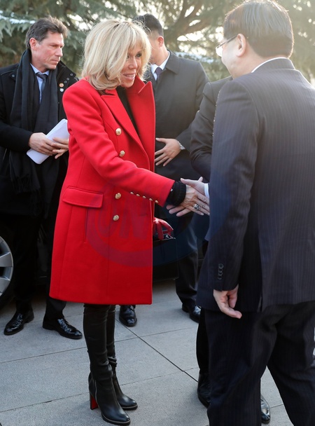 Brigitte Macron w czerwonym plaszczyku i Emmanuel Macron podczas wizyty w Chinach