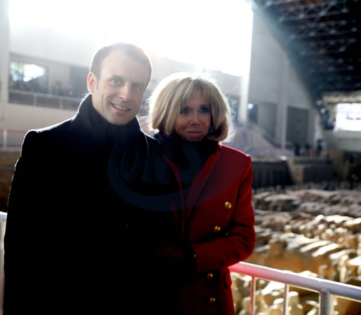 Brigitte Macron w czerwonym plaszczyku i Emmanuel Macron podczas wizyty w Chinach