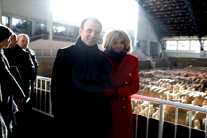 Brigitte Macron w czerwonym plaszczyku i Emmanuel Macron podczas wizyty w Chinach