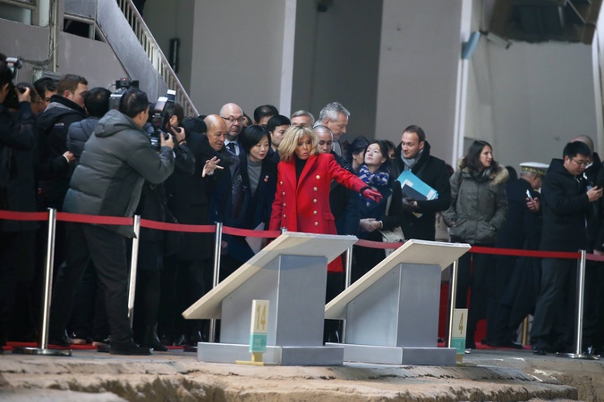 Brigitte Macron w czerwonym plaszczyku i Emmanuel Macron podczas wizyty w Chinach