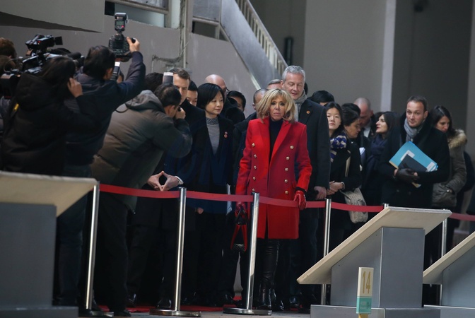 Brigitte Macron w czerwonym plaszczyku i Emmanuel Macron podczas wizyty w Chinach