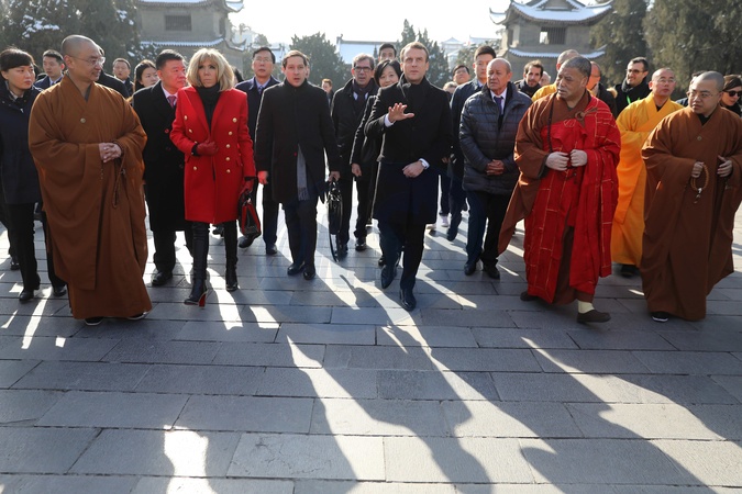 Brigitte Macron w czerwonym plaszczyku i Emmanuel Macron podczas wizyty w Chinach