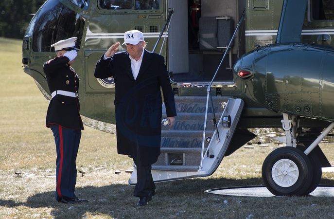 Donald Trump w eleganckim, czarnym plaszczu i bialej czapce z daszkiem USA