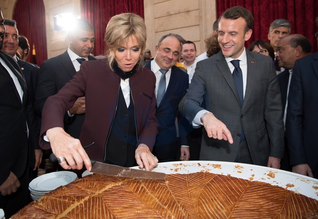 Brigitte Macron i Emmanuel Macron kroja tradycyjne ciasto podczas uroczystosci w Palacu Elizejskim