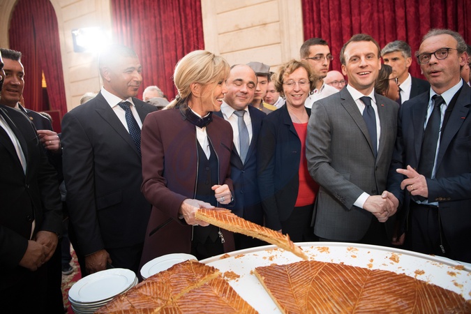 Brigitte Macron i Emmanuel Macron kroja tradycyjne ciasto podczas uroczystosci w Palacu Elizejskim