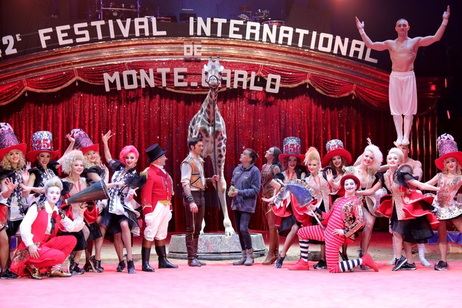 Ksiezniczka Stefania karmi zyrafe na 42. Monte-Carlo International Circus Festival