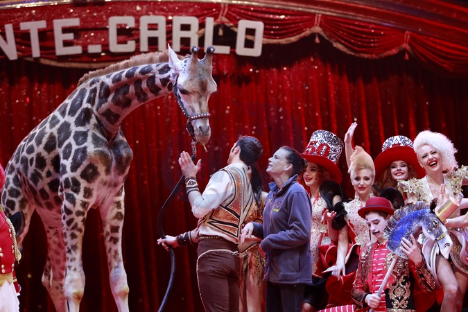 Ksiezniczka Stefania karmi zyrafe na 42. Monte-Carlo International Circus Festival