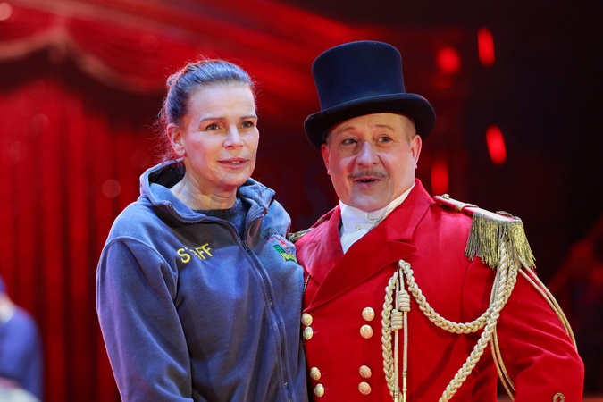 Ksiezniczka Stefania karmi zyrafe na 42. Monte-Carlo International Circus Festival