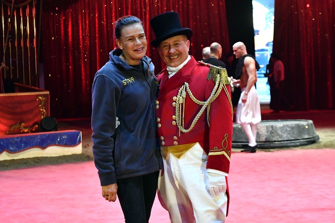 Ksiezniczka Stefania karmi zyrafe na 42. Monte-Carlo International Circus Festival