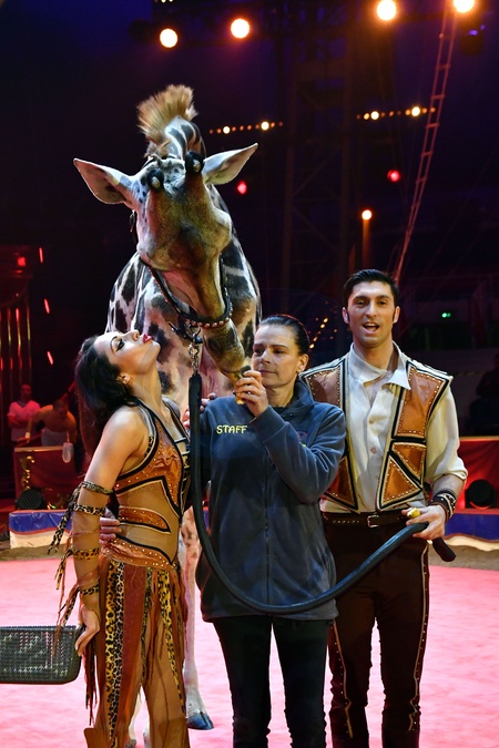 Ksiezniczka Stefania karmi zyrafe na 42. Monte-Carlo International Circus Festival