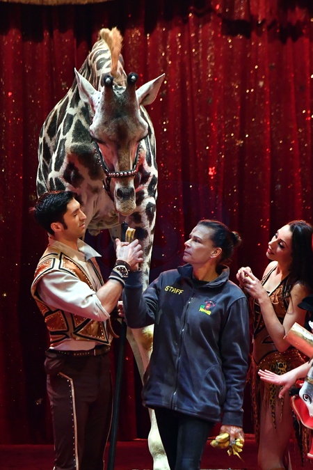 Ksiezniczka Stefania karmi zyrafe na 42. Monte-Carlo International Circus Festival