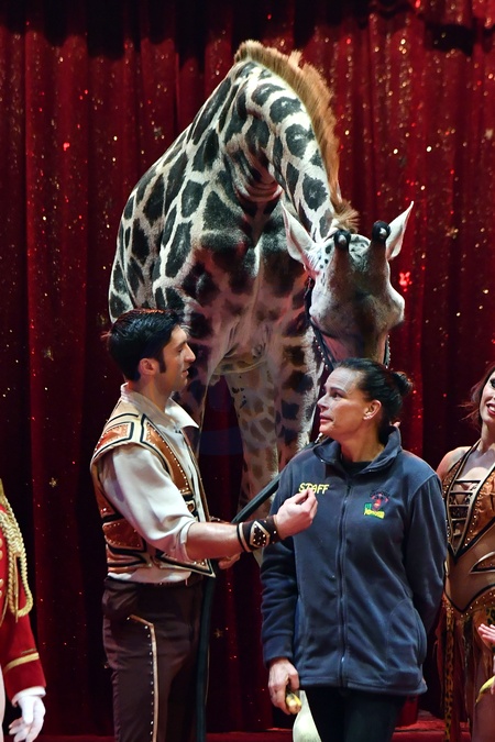 Ksiezniczka Stefania karmi zyrafe na 42. Monte-Carlo International Circus Festival