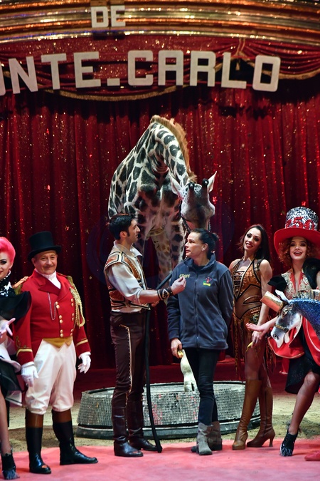 Ksiezniczka Stefania karmi zyrafe na 42. Monte-Carlo International Circus Festival