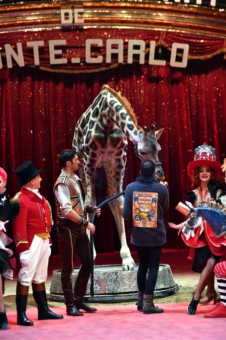 Ksiezniczka Stefania karmi zyrafe na 42. Monte-Carlo International Circus Festival