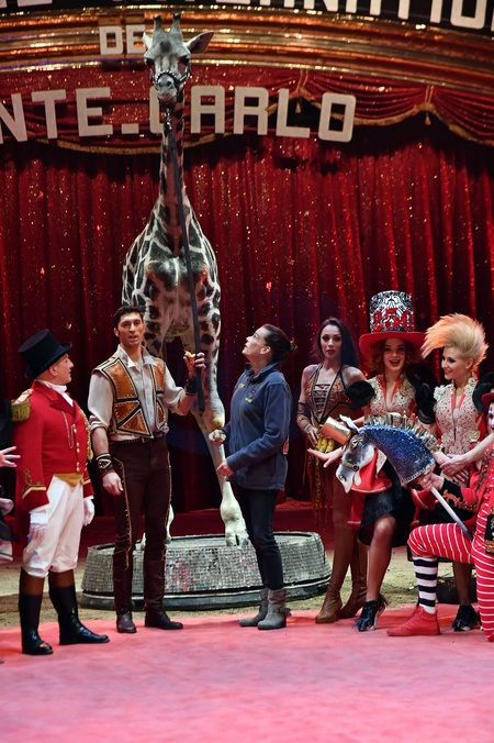 Ksiezniczka Stefania karmi zyrafe na 42. Monte-Carlo International Circus Festival