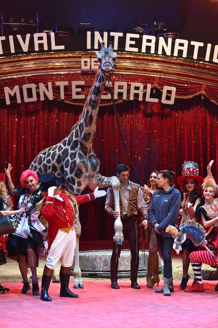 Ksiezniczka Stefania karmi zyrafe na 42. Monte-Carlo International Circus Festival