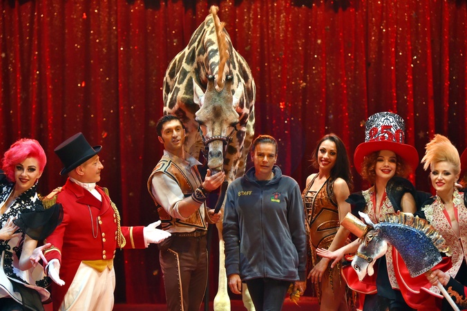 Ksiezniczka Stefania karmi zyrafe na 42. Monte-Carlo International Circus Festival