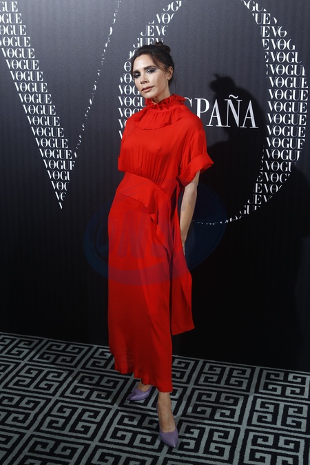 Victoria Beckham w czerwonej sukni, bez stanika na imprezie Vogue w Madrycie