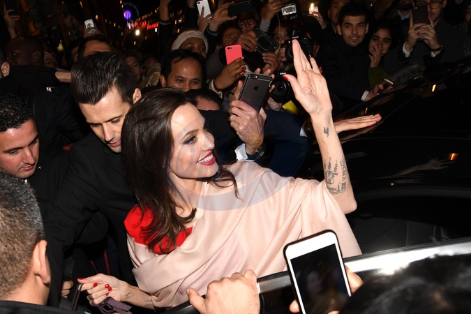 Angelina Jolie w tlumie fanow przed Domem Mody Guerlain